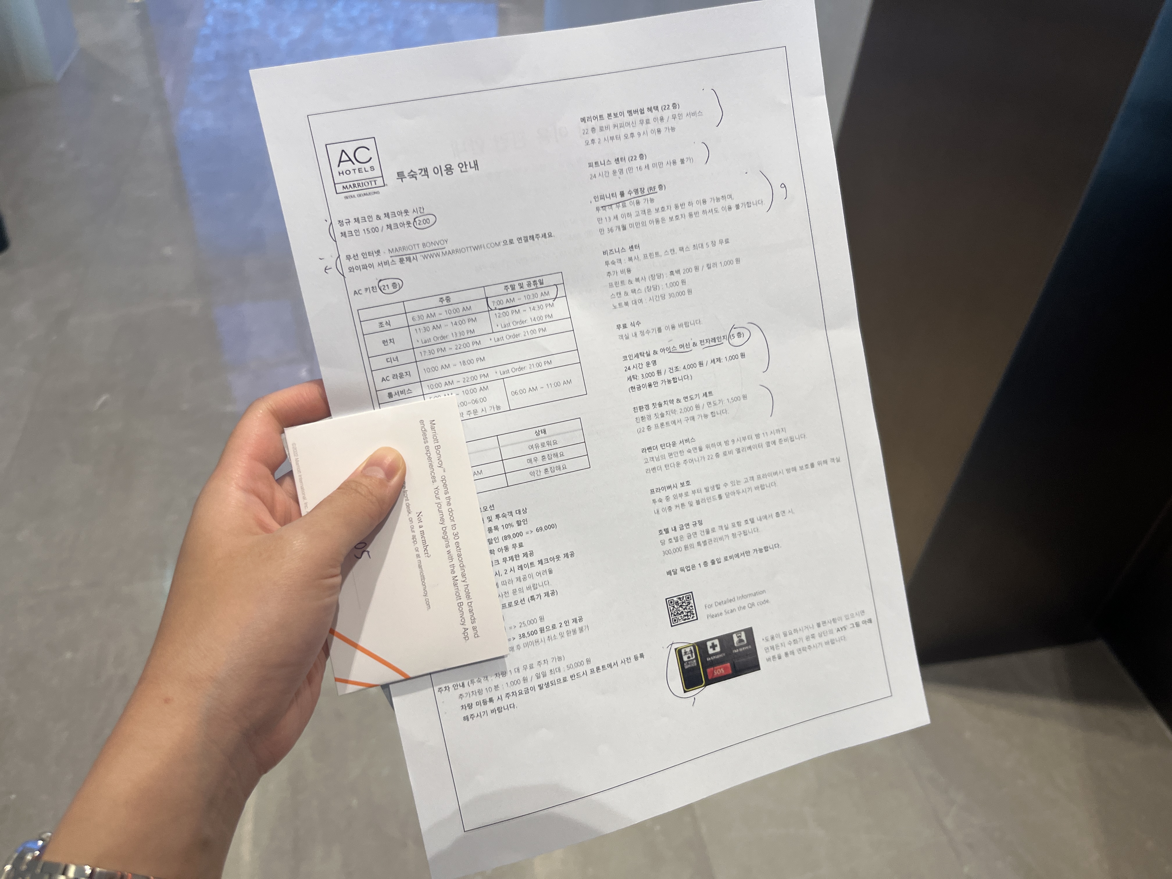 체크인 시 직원분이 안내문을 주시는데, 거기에 조식 시간, 수영장 운영 시간, 헬스장 위치, 레스토랑 할인 혜택 등 잘 정리되어 있습니다.